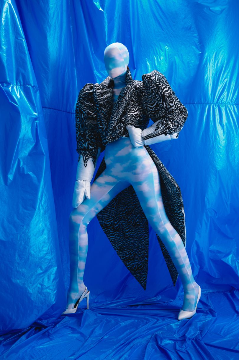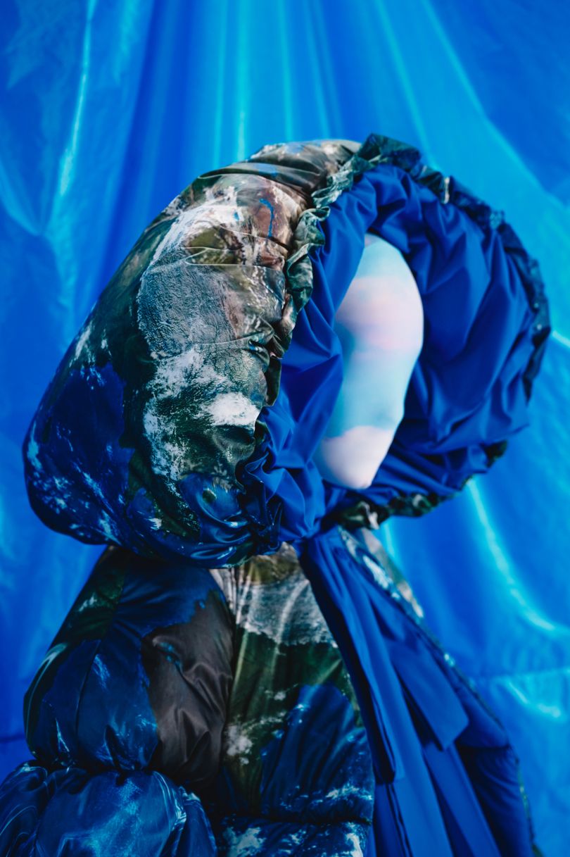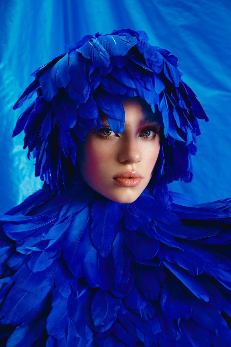 Каждый из образов коллекции символизирует тот или иной фрагмент истории и напоминает скорее работы в музее современного искусства, чем одежду в привычном понимании. Белоснежное платье из пуха, словно вырастающее из подола-основания – аллюзия на статуи древнегреческих богов, которыми прославился Дедал. Эффектные головные уборы из перьев – переосмысленные крылья. Светящиеся изнутри пышные юбки – такое желанное и одновременно беспощадное для Икара солнце. Синий цвет – это небо и море.