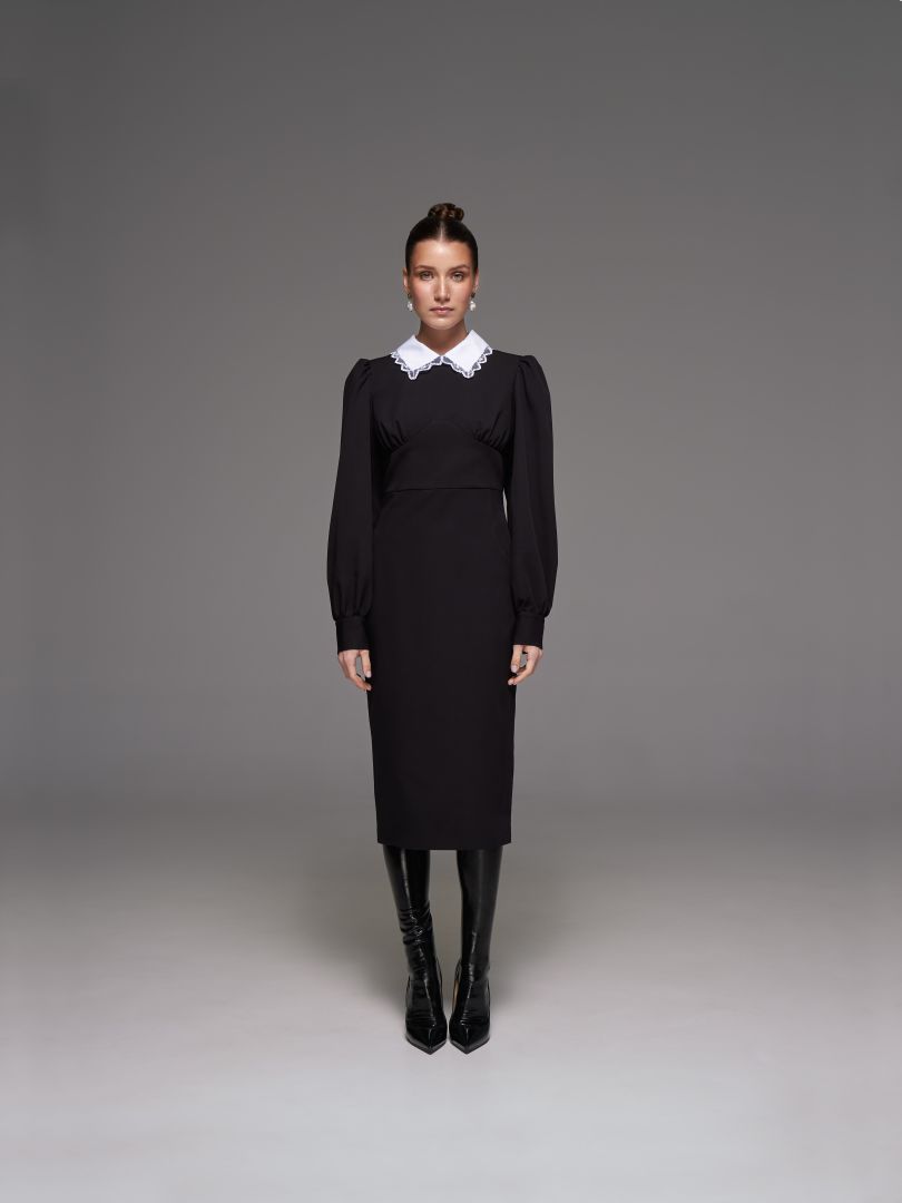- 2. Платье-футляр с белым воротничком – любимая вещь этой коллекции. В то же время сдержанная и сексуальная, оставляет загадку, подчеркивает и прячет все от глаз окружающих.