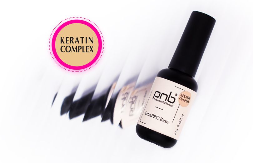 ExtraPro Base PNB, Keratin Complex 一 профессиональная каучуковая, гипоаллергенная база с кератином для создания ультрастойкого маникюра. Ее использование минимизирует сенсибилизацию кожи, ведь в формуле заменен мономер HEMA на HPMA. База насыщена кератином, который уплотняет, обеспечивает усиленную защиту, а также максимальное сцепление с ногтевой пластиной.