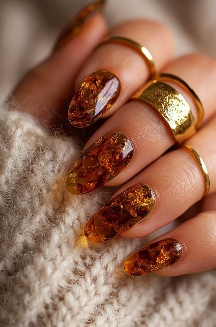В честь года Красной Огненной Лошади стоит попробовать маникюр с эффектом янтаря. Его создают прозрачными слоями геля с золотыми вкраплениями, которые переливаются на свету. Также для создания маникюра используют теплые оттенки, например медовый, янтарный или оранжевый. Это идеальный вариант для новогодних праздников, который хорошо сочетается с различными образами.