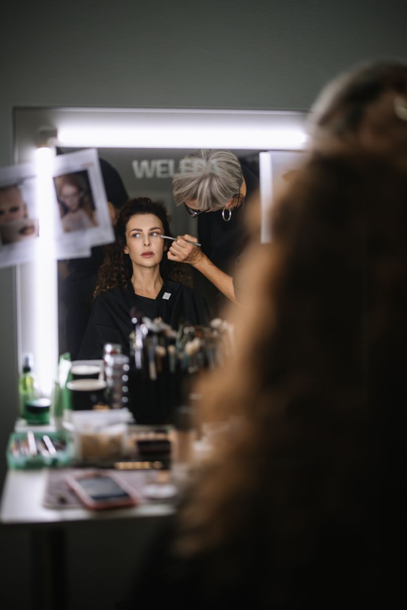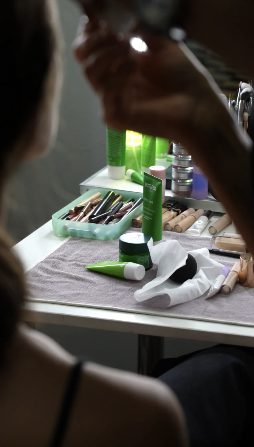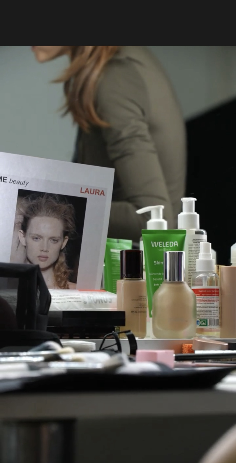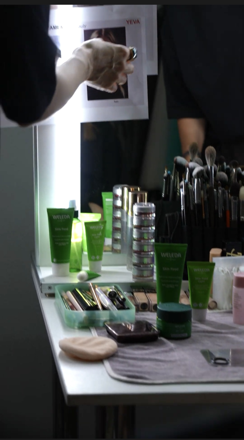 Подготовка моделей к выходу сопровождалась использованием культового Skin Food от Weleda — крема, который придаёт коже естественное сияние. Его нанесли на скулы, веки, губы и ключицы, чтобы свет софитов подчеркнул живое сияние изнутри.