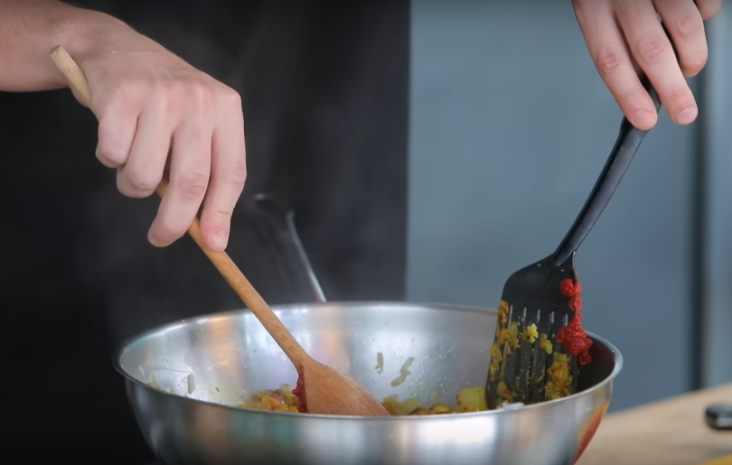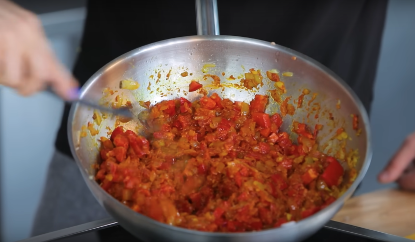3. В сковороду добавить карри, куркуму, томатную пасту и нарезанные помидоры. Помешивая, тушить соус в течение 5 минут.