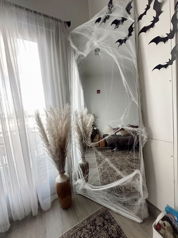 Кроме этого, об осеннем празднике напоминает искусственная паутина, которую вешают около магазинов, заведений или домов. Она ассоциируется с заброшенными помещениями, где могут жить призраки. Это навевает легкий страх и соответствует тематике праздника. Паутины можно сделать из ваты, марли или ниток и украсить ею подоконники, столы или зеркало помещения.