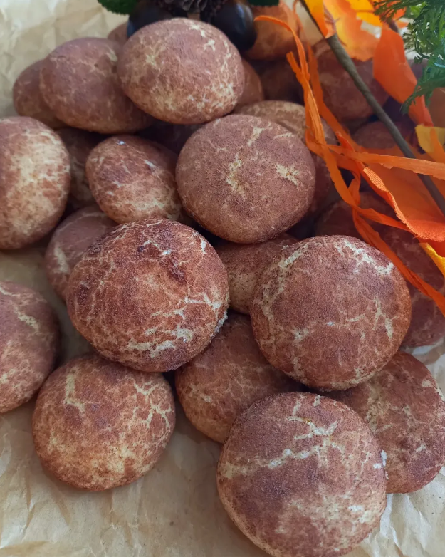 Можно сделать печенье в виде паутины. Для этого нужно взбить 3 яйца с 300 граммами сахара. Затем всыпьте 150 грамм манки и перемешайте. Далее добавляем 360 грамм просеянной муки и 7 грамм разрыхлителя. Все тщательно перемешиваем. Из массы формируем шарики, предварительно смочив руки водой. Посыпаем шарики какао и ставим на противень, выстланный пергаментом. Выпекаем при 180°С около 15 минут.