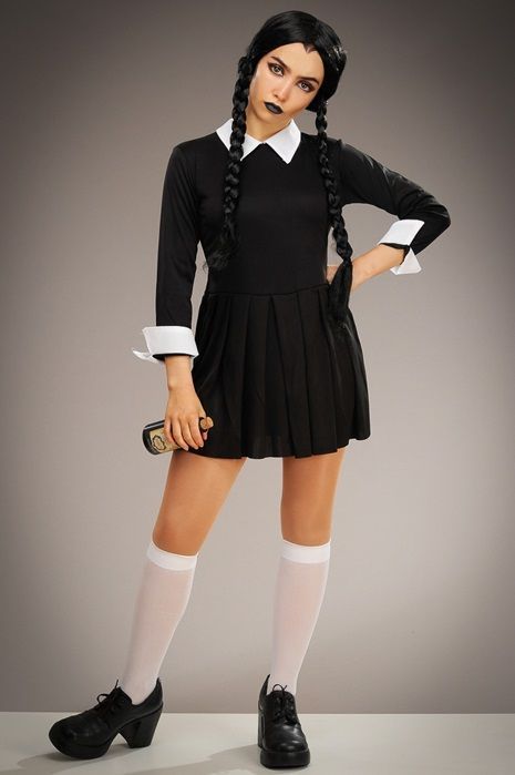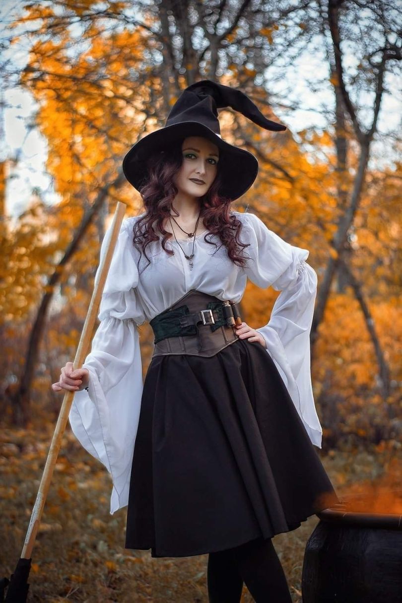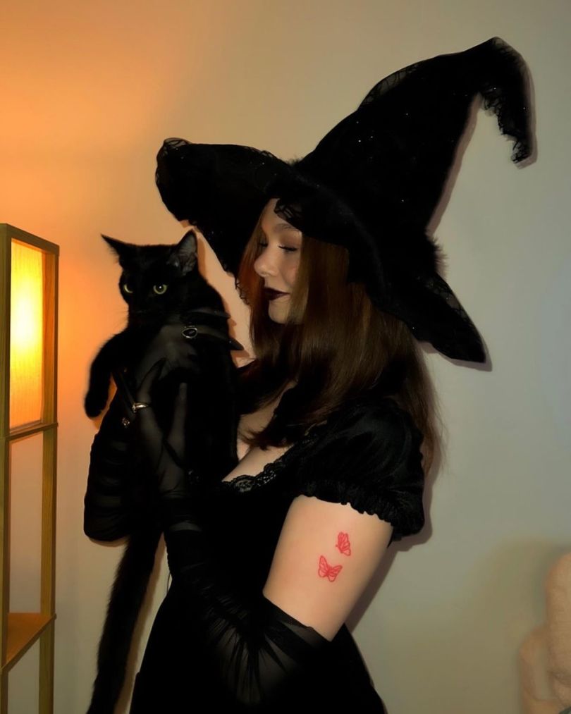Если нет возможности приобрести или взять костюм напрокат, можно создать праздничный аутфит из того, что есть. Например, возьмите черное платье или штаны со свитером, сделайте яркий макияж в темных тонах и завершите образ шляпкой.