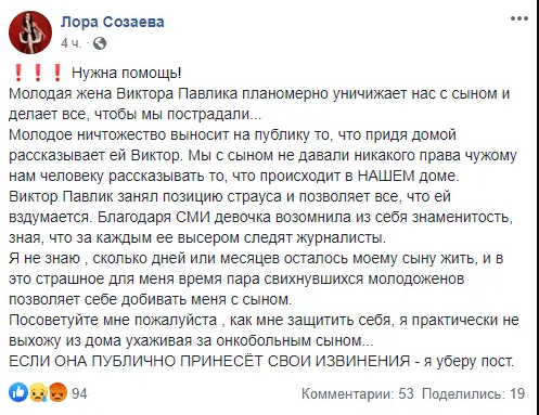 "Молодая жена Виктора Павлика планомерно уничтожает нас с сыном и делает все, чтобы мы пострадали. Молодое ничтожество выносит на публику то, что, придя домой, рассказывает ей Виктор. Мы с сыном не давали никакого права чужому нам человеку рассказывать, что происходит в нашем доме. Виктор Павлик занял позицию страуса и позволяет все, что ей вздумается. Я не знаю, сколько дней или месяцев осталось моему сыну жить. И в это страшное для меня время пара свихнувшихся молодоженов позволяет себе добивать меня с сыном", - написала Созаева, добавив, что если Репяхова принесет ей публичные извинения, она удалит пост.