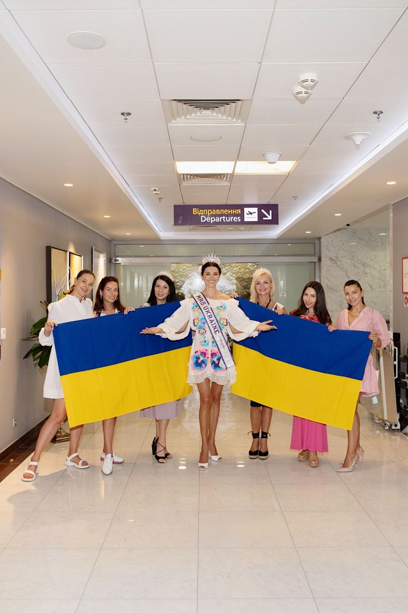 В аэропорт «Борисполь» Татьяну торжественно провожали любимый муж, лучшие подруги, участницы и команда, которая занималась подготовкой к конкурсу, пресса. Для вылета Ровная выбрала летящее платье с национальными элементами в декоре и, конечно, корону победительницы как главный аксессуар.