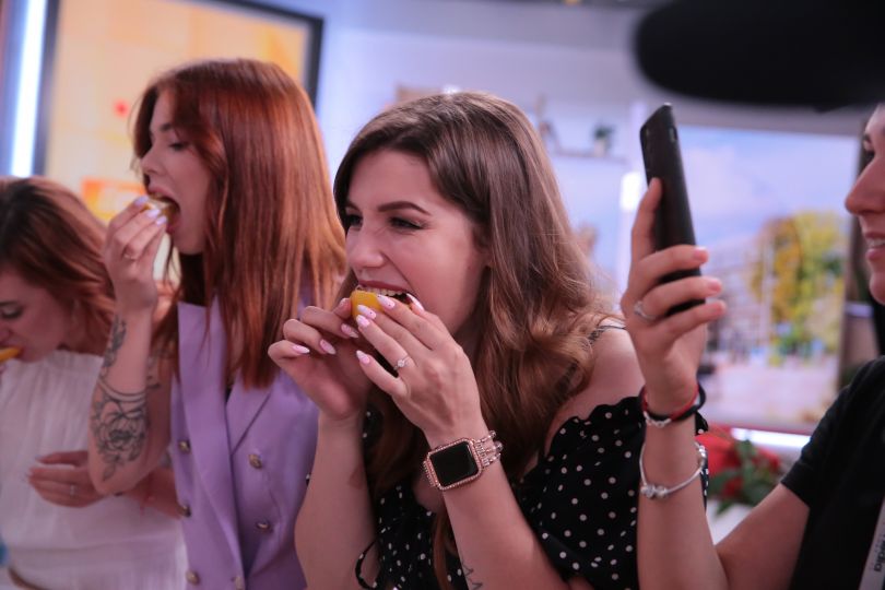 Звезды соцсетей провели мастер-класс по созданию Инстаграм и TikTok видео для телеведущих, чтобы собрать больше лайков и реакций. Вова Рабчун так вдохновился успехами девушек, что впервые стартовал в свой TikTok общим видео с Яной Догой. В ответ телезвезды 1+1 поделились секретами работы в прямом эфире и решили проверить леди блогеров на ловкость, устроив им батл. «У вас лимоны подписчиков, а у нас есть настоящие!» — сказала Стася Ровинская и предложила съесть кислые лимоны на скорость. Участники разделились на две команды: телеведущие против блогерш.