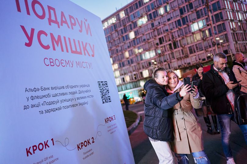 Індекс щастя. І це тільки початок масштабного фотопроєкту. З метою підвищення національного “індексу щастя” банк запустив флешмоб “Подаруй усмішку”. 1 жовтня стартувала перша трансляція — вже сьогодні тисячі облич усміхаються до перехожих з величезних LED-екранів Києва, Харкова, Дніпра та Одеси. Щоб взяти участь у флешмобі, достатньо зробити усміхнене селфі та завантажити у застосунок банку Sense SuperApp.