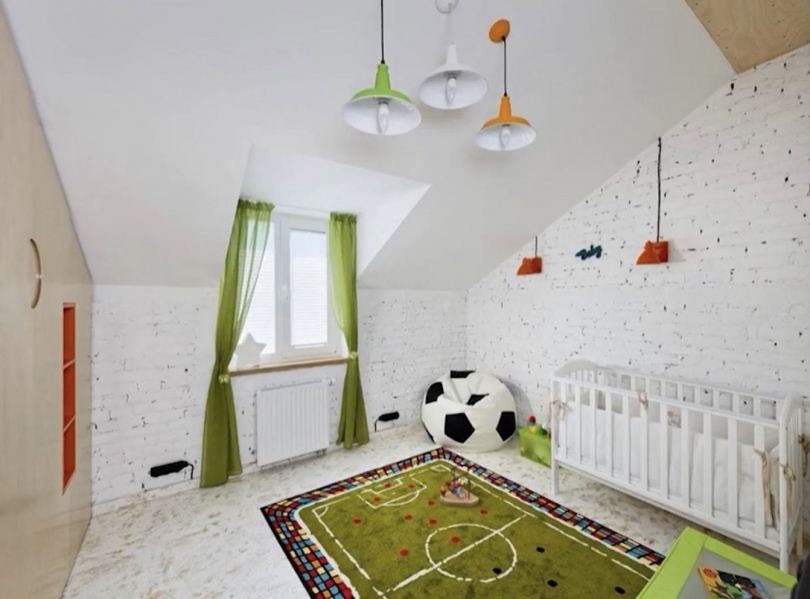 На втором этаже находится детская Леона, оформленная в стиле футбольного стадиона. А в спальне хозяев довольно интересное интерьерное решение – это ванная, стоящая посреди комнаты, и декоративная дыра в стене у туалетного столика Лиланы.