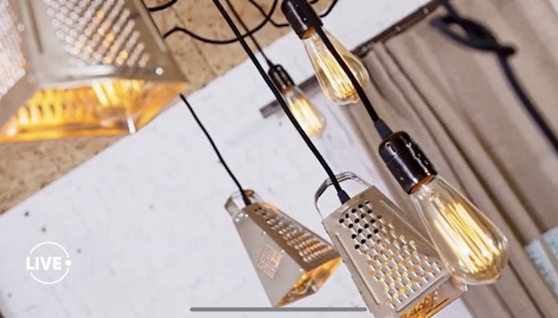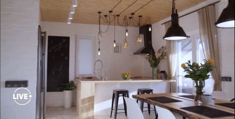 Внутренняя отделка особняка выполнена в стиле лофт. На первом этаже кухня и гостиная с камином. Все светильники авторские и довольно оригинальны: в форме терки для моркови или кранов для воды.