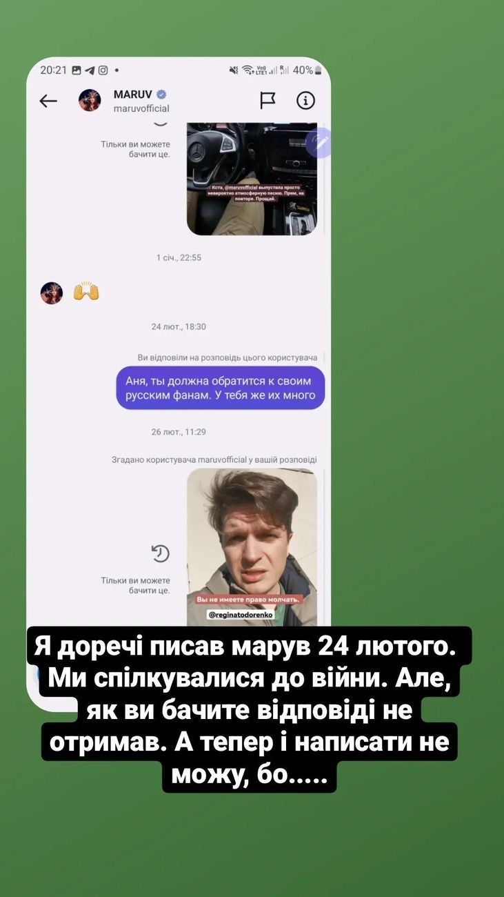 Он отметил, что до 24 февраля они общались между собой, но Maruv решила его игнорировать, как только Анатолич попросил рассказать российской аудитории правду о войне. Позже профиль артистки был заблокирован для украинцев.