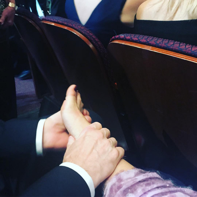 Так, благодаря Сальме Хайек, а точнее - фотографии в ее личном микроблоге, стало известно, что находясь в зале во время премии супруг актрисы делал ей массаж ног. Да-да, это правда, и об этом свидетельствует вышеупомянутый кадр. Вероятно, для "Оскара" Сальма выбрала не очень удобные туфли, и ей понадобился срочный массаж.