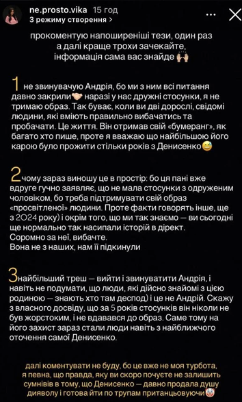 «Самый большой треш — выйти и обвинить Андрея и даже не подумать, что люди, которые действительно знакомы с этой семьёй, знают, кто там деспот, и это не Андрей. Скажу из собственного опыта, что за пять лет отношений он никогда не был жестоким и не прибегал к оскорблениям. Именно поэтому на его защиту сейчас встали люди даже из ближайшего окружения самой Денисенко», — поделилась она.
