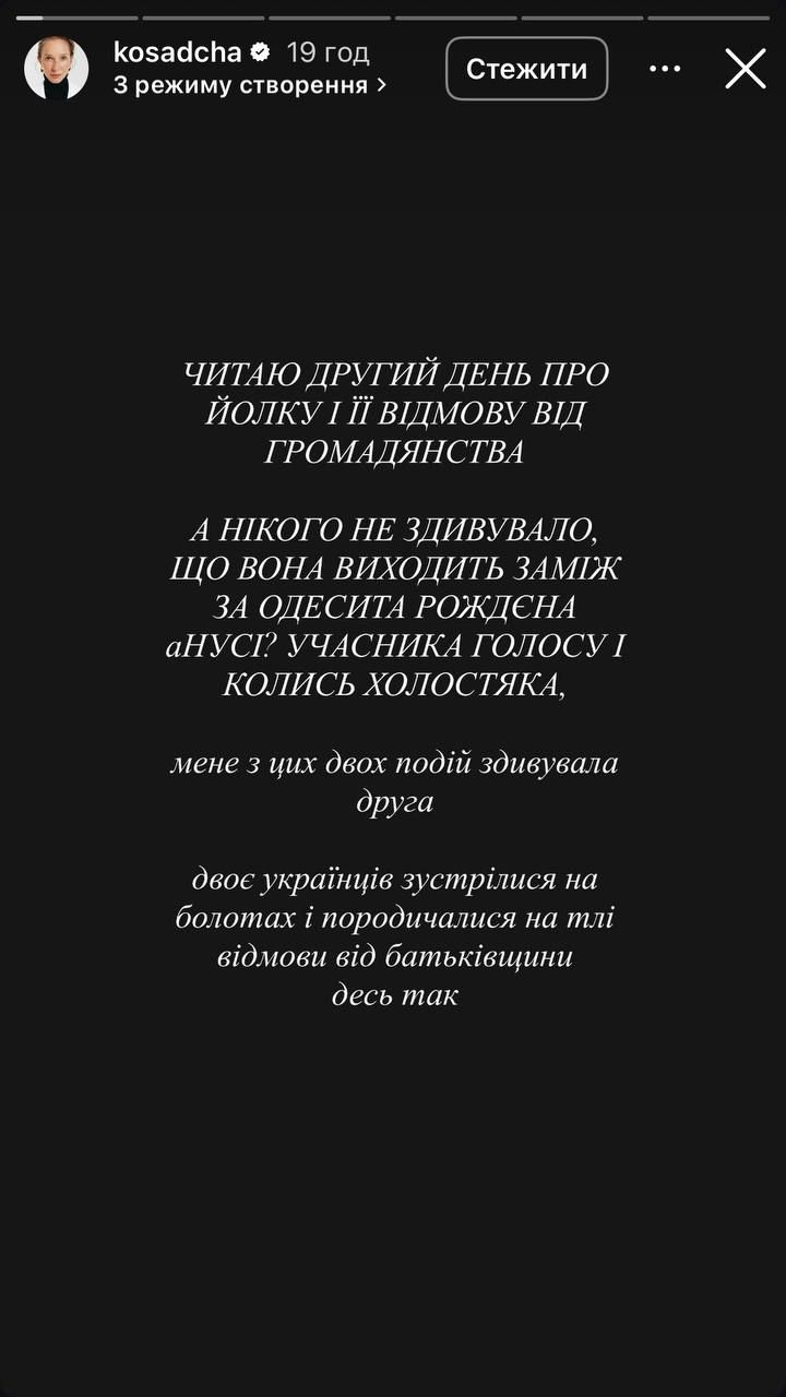 На своей странице в инстаграме Осадчая возмутилась тем, что Ёлка вступила в брак с Рожденом, ведь оба живут в России и молчат о полномасштабной войне против Украины. Также ведущая считает, что когда-то известные украинские артисты сблизились на фоне отречения от родины. К тому же Екатерину удивило, что певица отказалась от украинского гражданства.