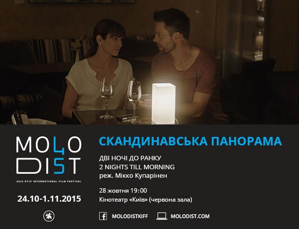 28 октября в 19:00 в Красном зале «Киева» будет показ фильма «Две ночи до утра» в рамках Скандинавской панорамы кинофестиваля  «Молодость».  Эта лента о том, как извержение вулкана меняет график полетов, а вместе с ним и человеческие судьбы.