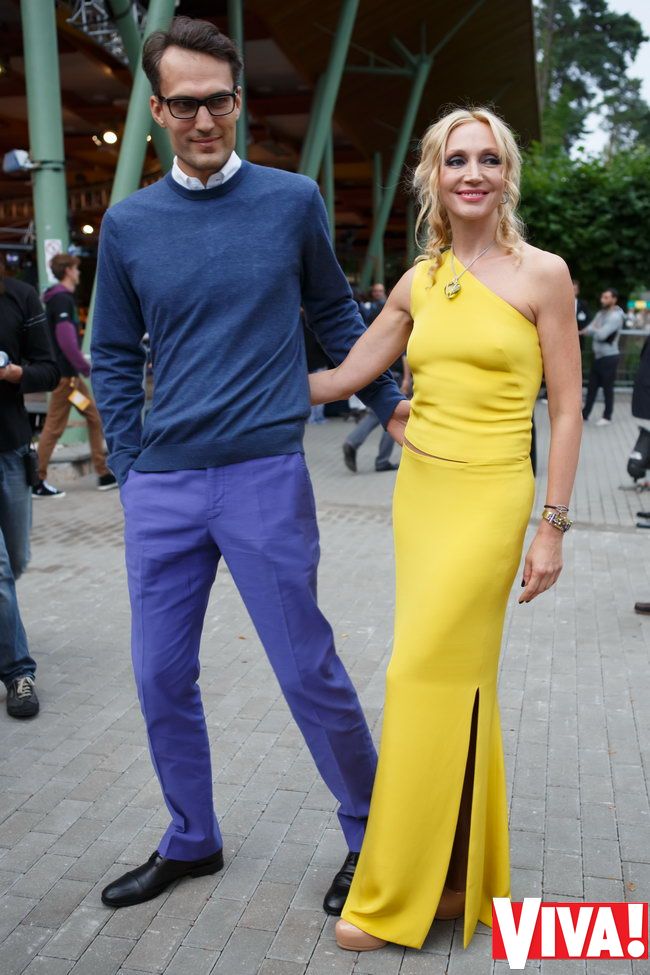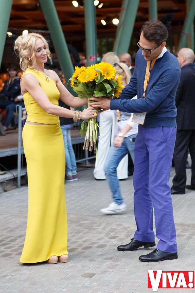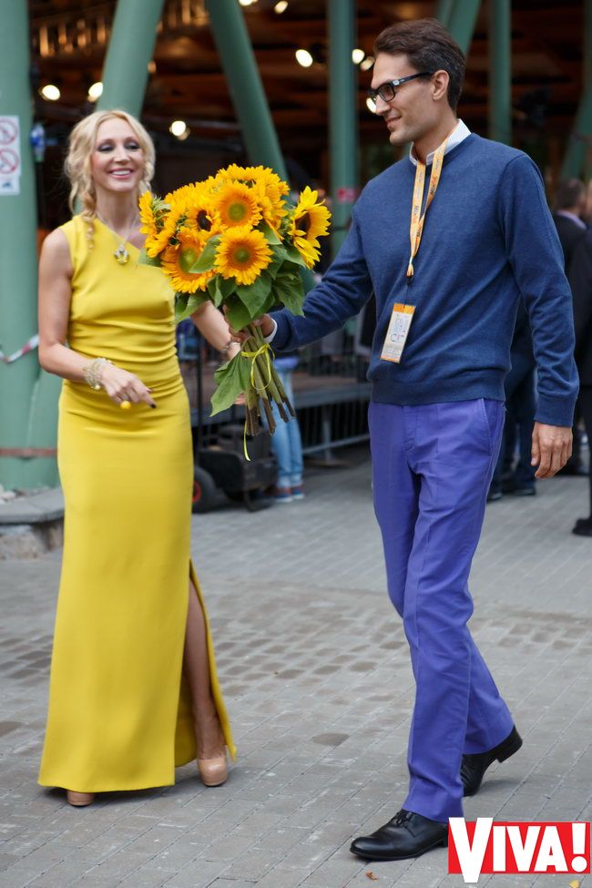 На «Новую волну 2013» звезда прибыла в компании своего супруга Михаила Земцова, который поддержал любимую роскошным букетом желтых декоративных подсолнечников.