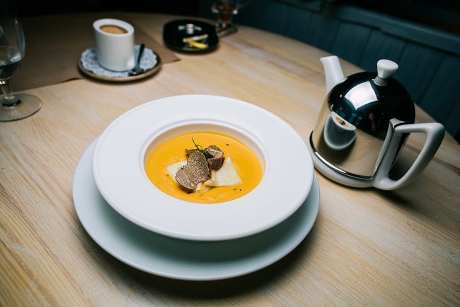 Умбрийская охота стартовала салатом - Перуджа, за ним последовалиКрем-суп Тартуфайо и основное блюдо с таинственным названием - Эксперимент от Мастер-Шефа, а в финале гостей ждал трюфельный десерт – пирожное Сокровище Ночи.