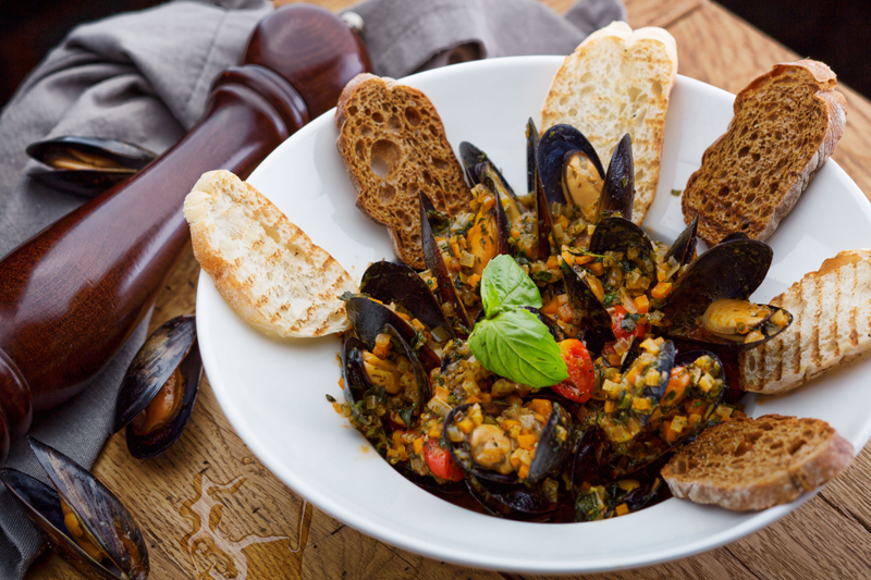 Мидии Мариньер с гренками из чиабатой
