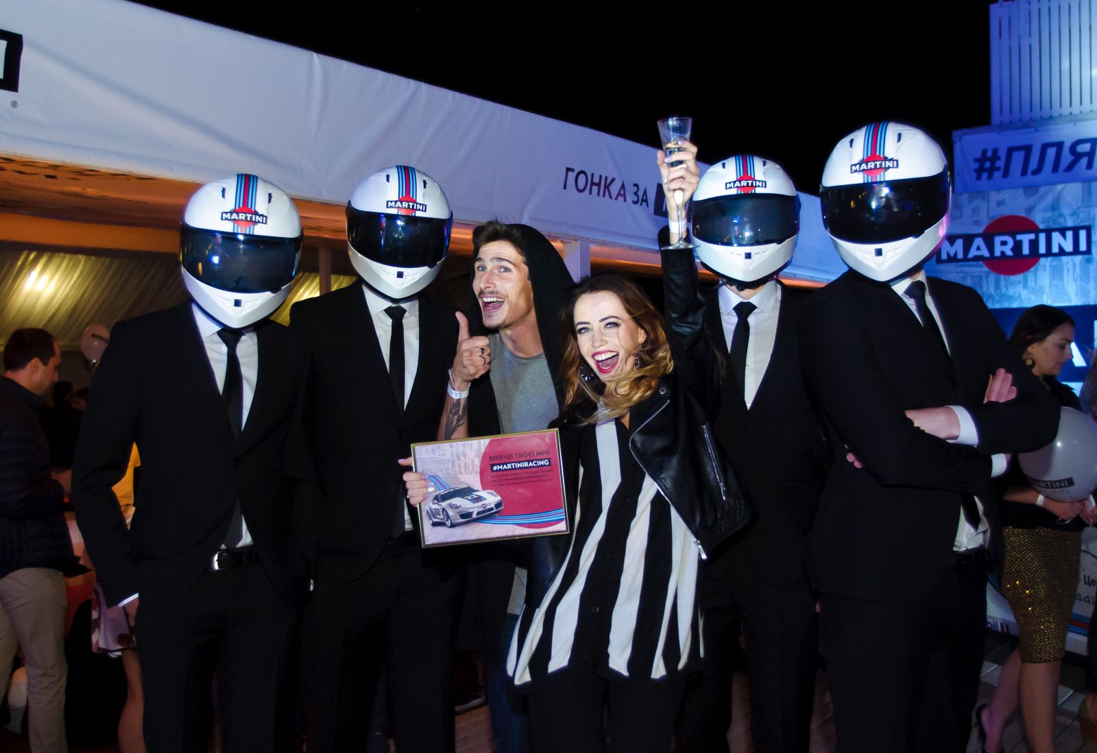 На Martini Racing Party гости общались и фотографировались с Иваном Дорном и Натальей Могилевской, а также могли и почувствовать себя известными гонщиками, попав в шумный и веселый зал с пьедесталом почета, награждениями и угощением от молодых людей в строгих черных костюмах и автогоночных шлемах.