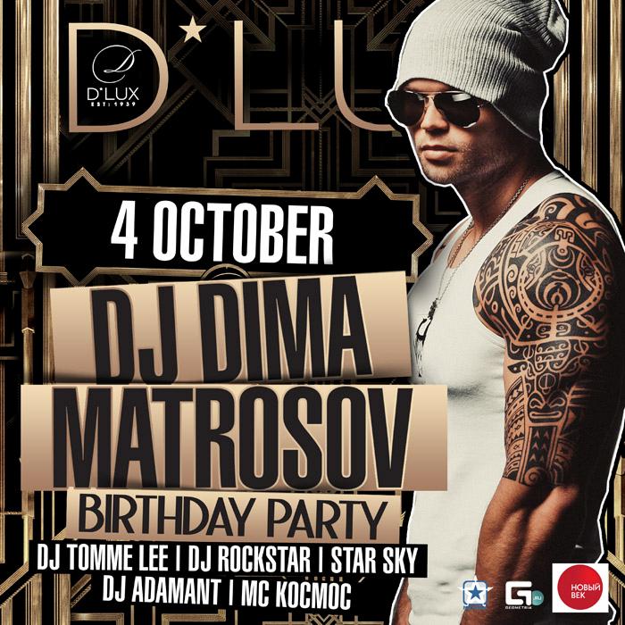 4 октября в развлекательном комплексе D*Lux празднует свой День Рождения красавец, спортсмен, телезвезда и талантливый резидент - DJ DIMA MATROSOV! Именинника поздравят лучшие диджеи столицы: Dj Tommy Lee, DJ Rockstar, DJ Star Sky, Dj Adamant.