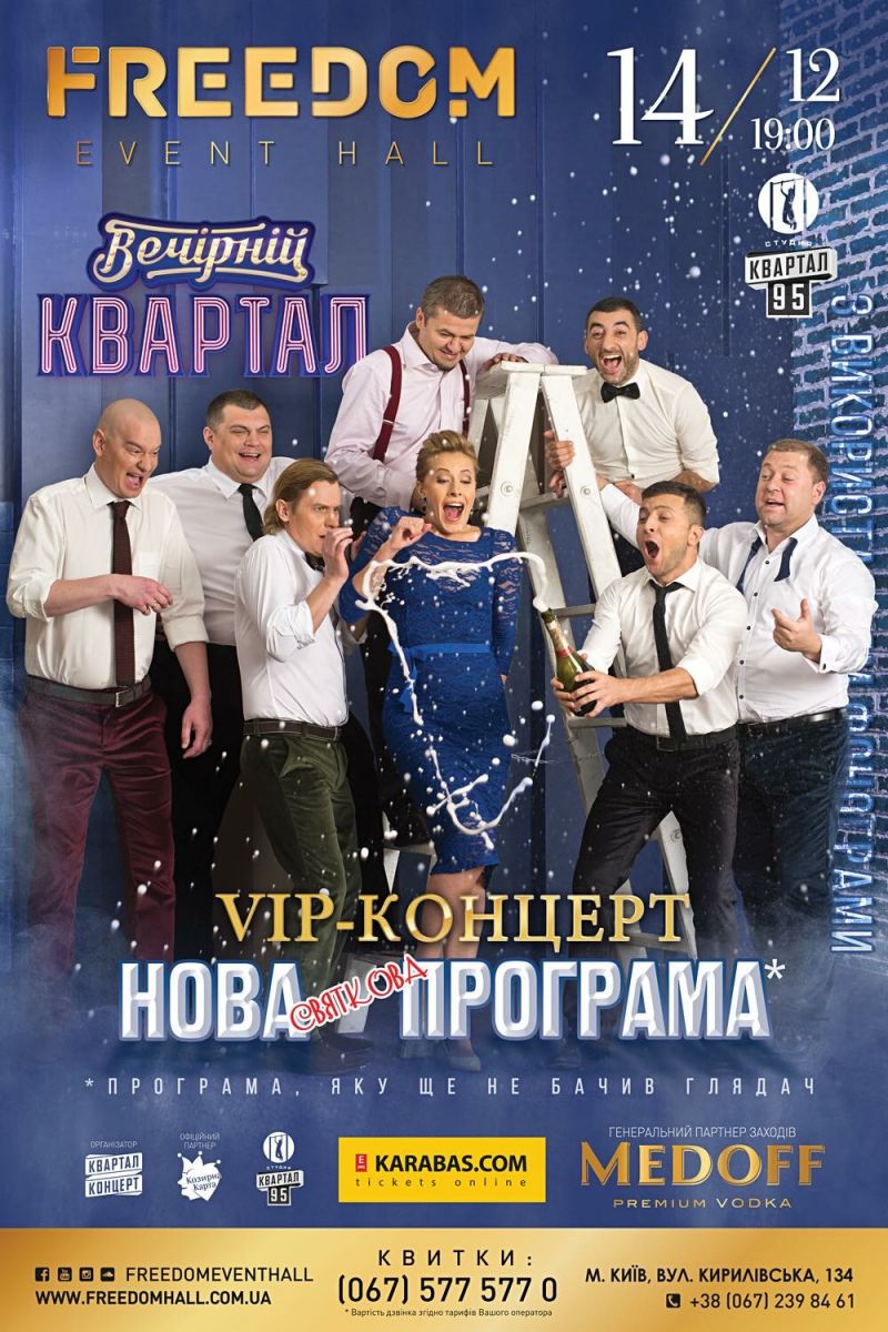 Хотите зарядиться позитивными эмоциями и по-настоящему весело провести время? Добро пожаловать на НОВЫЙ Новогодний VIP-концерт от «Вечернего квартала». Вас ждет незабываемая концертная программа и after-party с участием кавер-группы, DJ и других резидентов Event Hall. Здесь можно будет выпить шампанское за наступающий 2017-й год, а также продолжить вечер в уютном, оснащенном по последнему слову техники «Freedom Karaoke Hall».